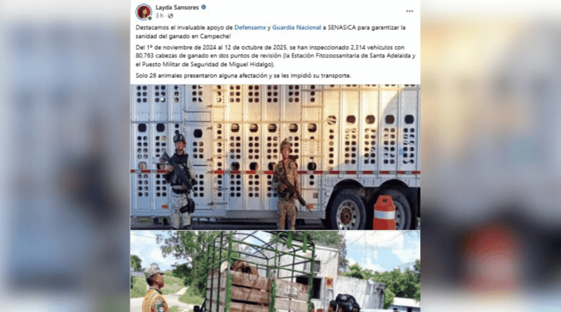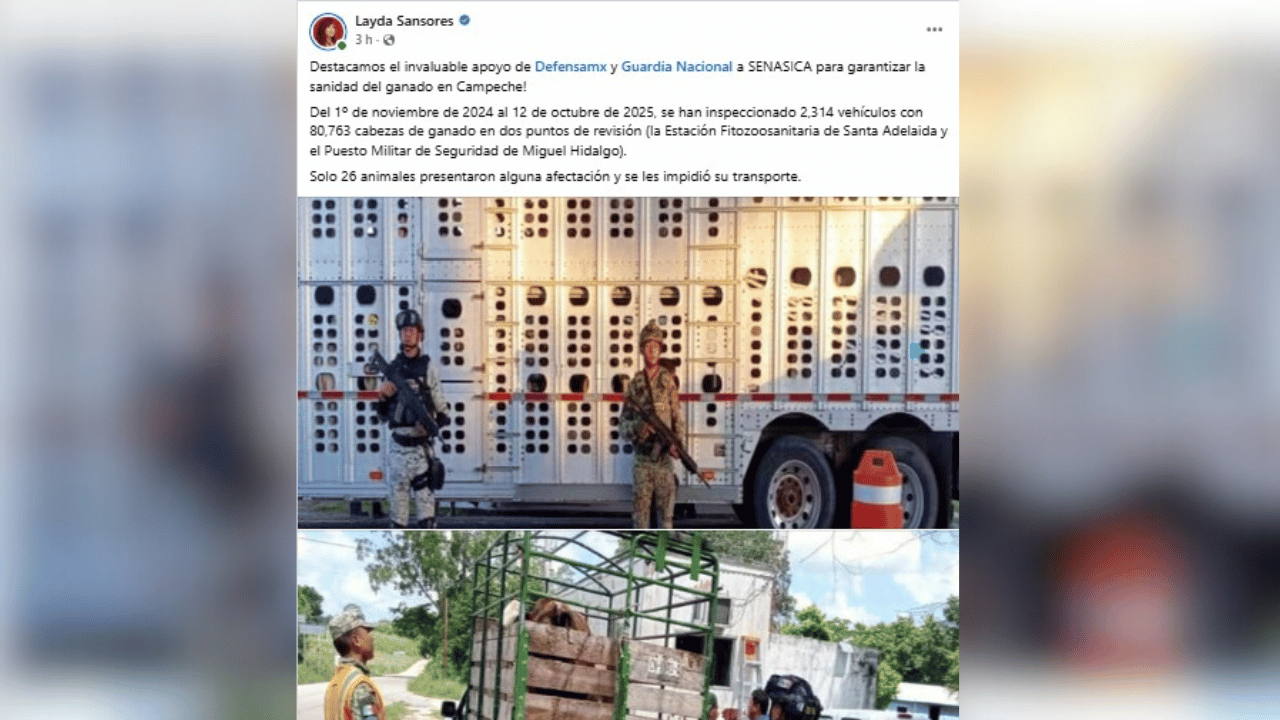 Precisó que del 1º de noviembre de 2024 al 12 de octubre de 2025, han sido inspeccionados dos mil 314 vehículos con 80 mil 763 cabezas de ganado en dos puntos de revisión: la Estación Fitozoosanitaria de Santa Adelaida y el Puesto Militar de Seguridad de Miguel Hidalgo.