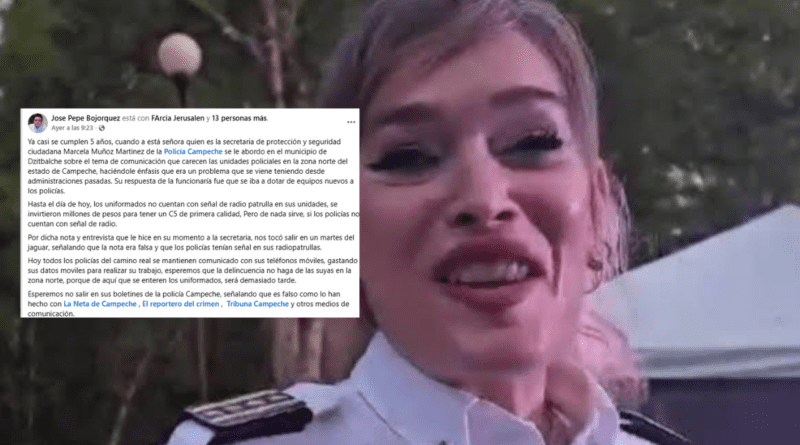 La publicación señala: “Ya casi se cumplen 5 años, cuando a esta señora, quien es la secretaria de Protección y Seguridad Ciudadana, Marcela Muñoz Martínez, de la Policía Campeche, se le abordó en el Municipio de Dzitbalché sobre el tema de comunicación que carecen las unidades policiales en la zona norte del Estado, haciéndole énfasis en que era un problema que se tiene desde administraciones pasadas, y su respuesta fue que se iba a dotar de equipos nuevos a los policías. Hasta el día de hoy, los uniformados no cuentan con señal de radio patrulla en sus unidades, se invirtieron millones de pesos para tener un C5 de primera calidad, pero de nada sirve si los policías no cuentan con señal de radio”.