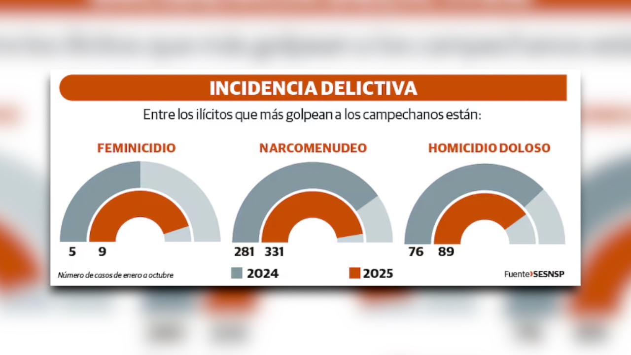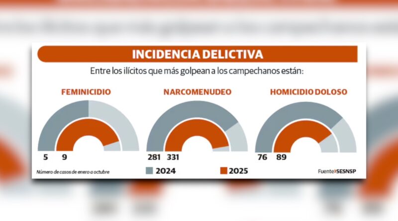 En Campeche, los delitos de feminicidio, homicidio doloso, secuestro y narcomenudeo tuvieron un incremento de 53.7 por ciento en promedio entre enero y octubre del 2025, en comparación con el mismo periodo del 2024.
