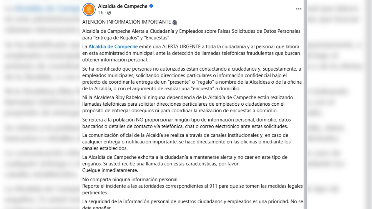 La Alcaldía de Campeche emitió alerta urgente dirigida a la ciudadanía y al personal que labora en la Administración municipal, tras detectar un esquema de llamadas telefónicas fraudulentas que buscan obtener información personal bajo engaños.
