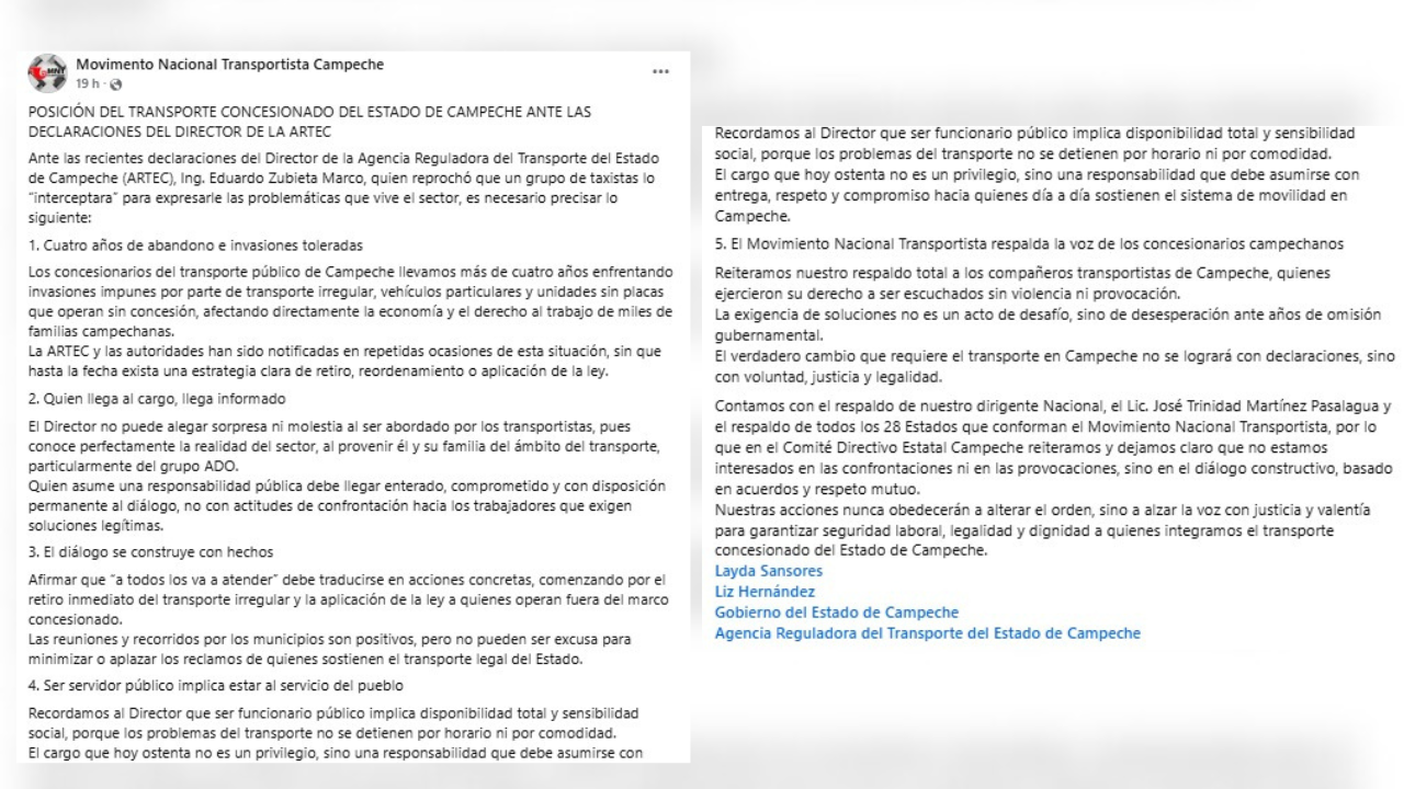 - El Movimiento Nacional Transportista respalda la voz de los concesionarios campechanos. Reiteramos nuestro respaldo total a los compañeros transportistas de Campeche, quienes ejercieron su derecho a ser escuchados sin violencia ni provocación. La exigencia de soluciones no es un acto de desafío, sino de desesperación ante años de omisión gubernamental. El verdadero cambio que requiere el transporte en Campeche no se logrará con declaraciones, sino con voluntad, justicia y legalidad.