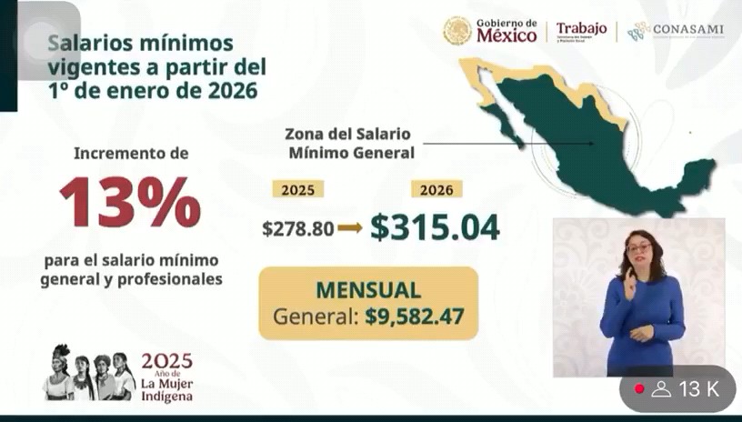 ANUNCIAN AUMENTO DE 13 % AL SALARIO MÍNIMO PARA 2026
