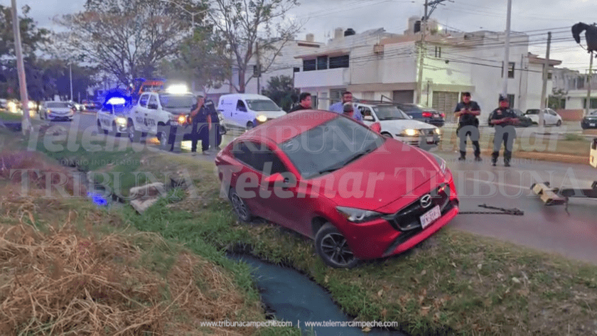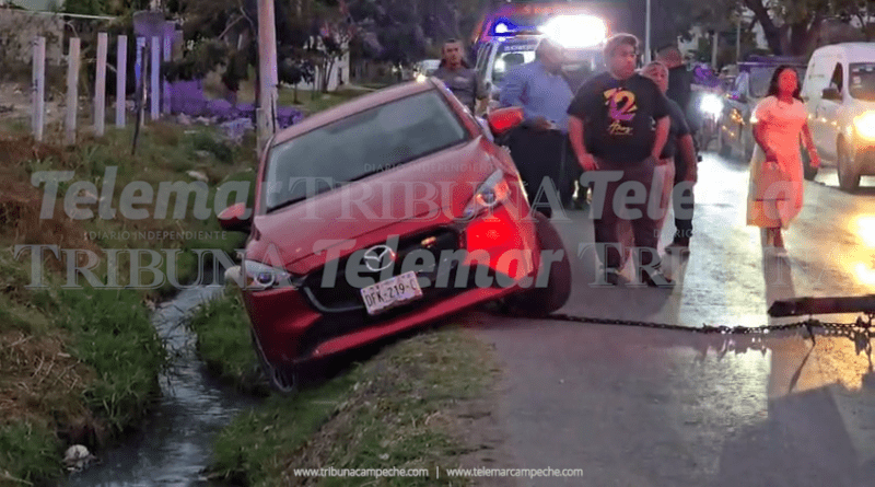 San Francisco de Campeche.- Un vehículo estuvo a punto de caer a una zanja de desagüe en la avenida Lázaro Cárdenas, luego de que su conductor intentara estacionarse sin percatarse del borde, quedando la unidad inclinada y a punto de volcar.