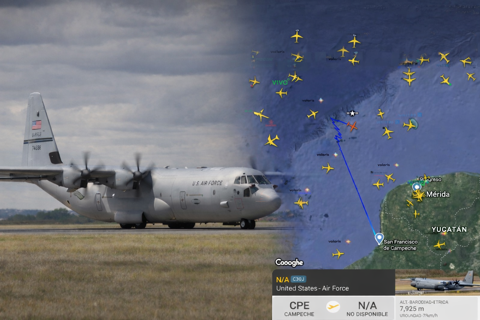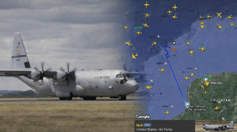 Un avión de la Fuerza Aérea de Estados Unidos realizó un sobrevuelo en el Golfo de México, con operación registrada desde el Aeropuerto Internacional “Ing. Alberto Acuña Ongay” de Campeche, según datos del portal especializado en tráfico aéreo Flightradar24. La plataforma identificó la aeronave como un Lockheed Martin C-130J Hércules, perteneciente a la United States Air Force.