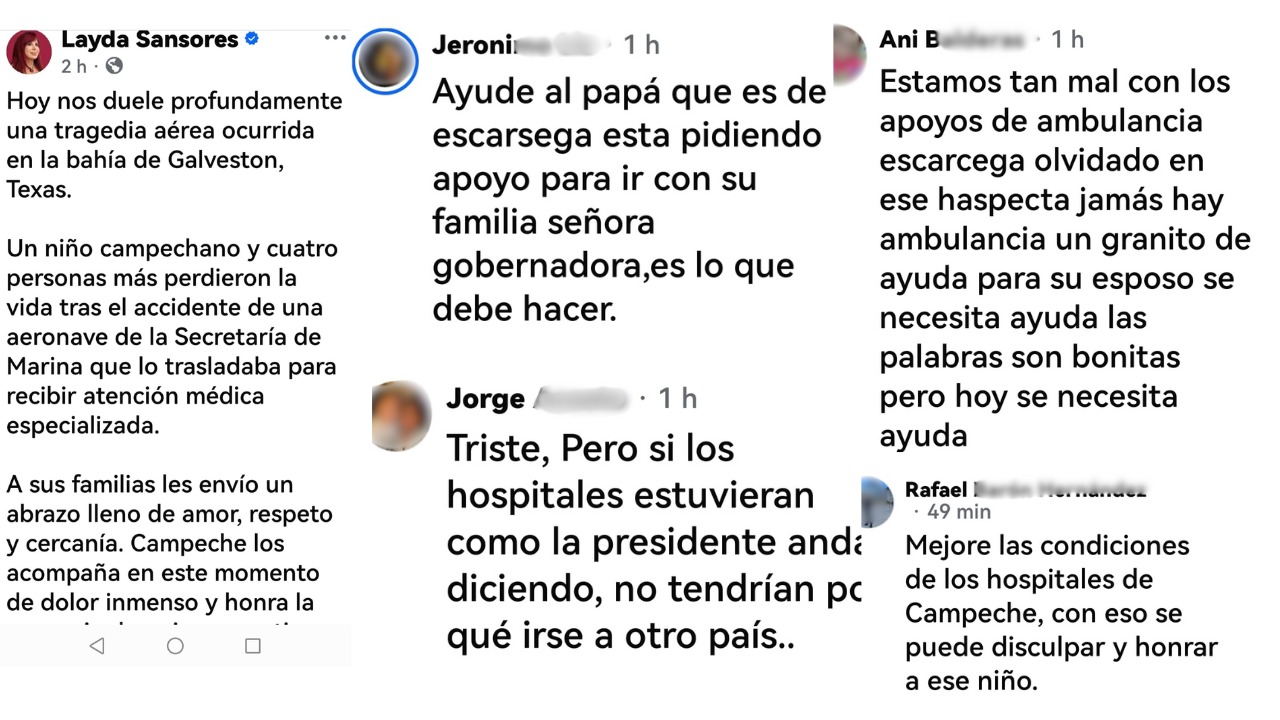 Las exigencias y los reproches a la falta de inversión en el sector salud fueron directas: “Ayude al papá que es de Escárcega, está pidiendo ayuda para ir con su familia señora gobernadora, es lo que debe hacer”, “Mejore las condiciones de los hospitales de Campeche, con eso se puede disculpar y honrar a ese niño”, “Triste, pero si los hospitales estuvieran como la presidente anda diciendo, no tendrían por qué irse a otro país”, y “Mejor que dé mantenimiento a los equipos de emergencia y no prioridad a los narcos”.