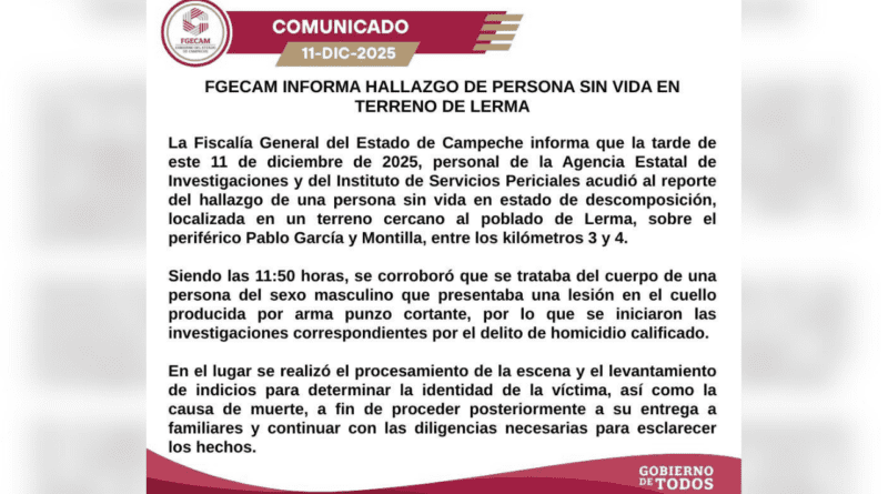 San Francisco de Campeche.- Al confirmar el hallazgo del cuerpo sin vida de un hombre en estado de descomposición en un terreno ubicado sobre el periférico Pablo García, cerca de Lerma, la Fiscalía General del Estado de Campeche (FGECAM) reveló que presenta “una lesión en el cuello producida por arma punzocortante, por lo que se iniciaron las investigaciones correspondientes por el delito de homicidio calificado”.
