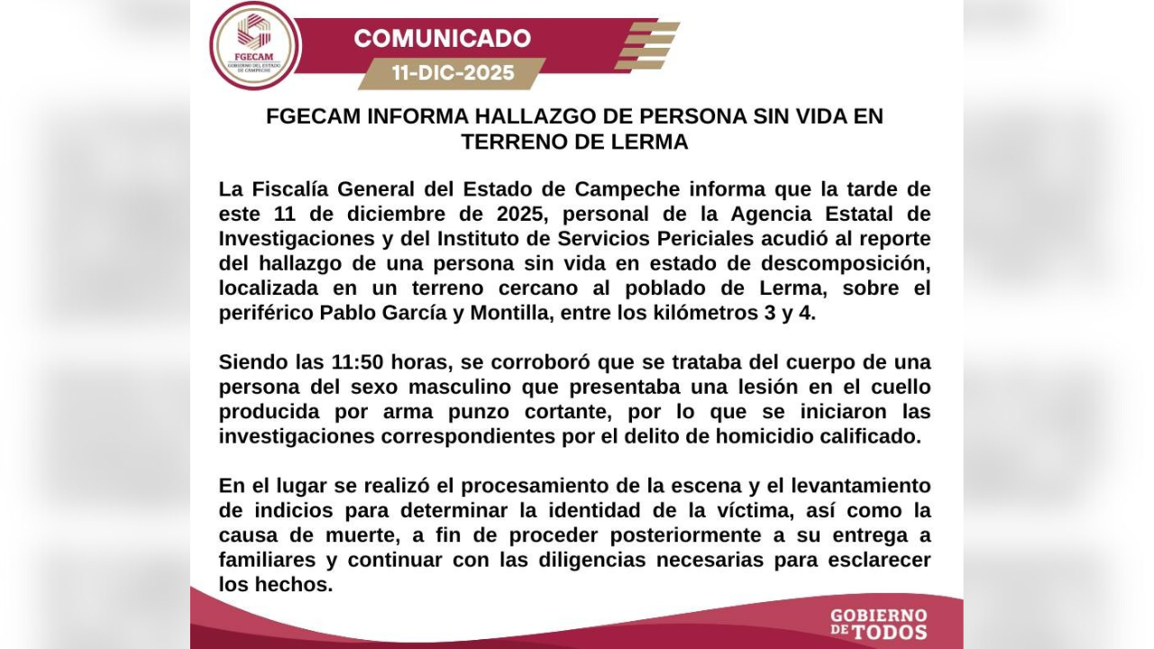 San Francisco de Campeche.- Al confirmar el hallazgo del cuerpo sin vida de un hombre en estado de descomposición en un terreno ubicado sobre el periférico Pablo García, cerca de Lerma, la Fiscalía General del Estado de Campeche (FGECAM) reveló que presenta “una lesión en el cuello producida por arma punzocortante, por lo que se iniciaron las investigaciones correspondientes por el delito de homicidio calificado”.
