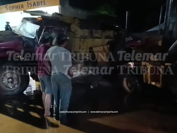 Calkiní.- Sobre la calle 19, entre 14 y 16 de la colonia Concepción, un volquete cayó en una zanja para cimiento de una construcción cuando descargaba material, sin que el chofer saliera h3r¡do. Fue rescatado por una retroexcavadora.