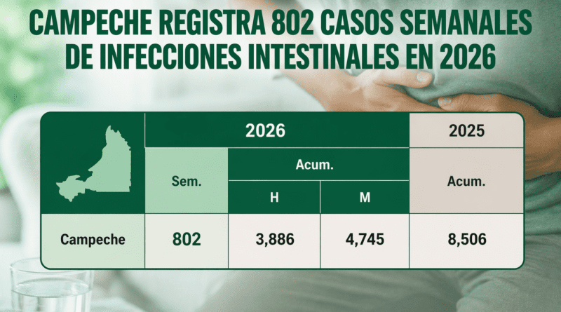 El estado de Campeche reportó 802 casos en la semana más reciente de infecciones intestinales por otros organismos y las mal definidas, de acuerdo con el registro correspondiente a 2026, del Informe Epidemiológico Semanal de la Secretaría de Salud Federal.