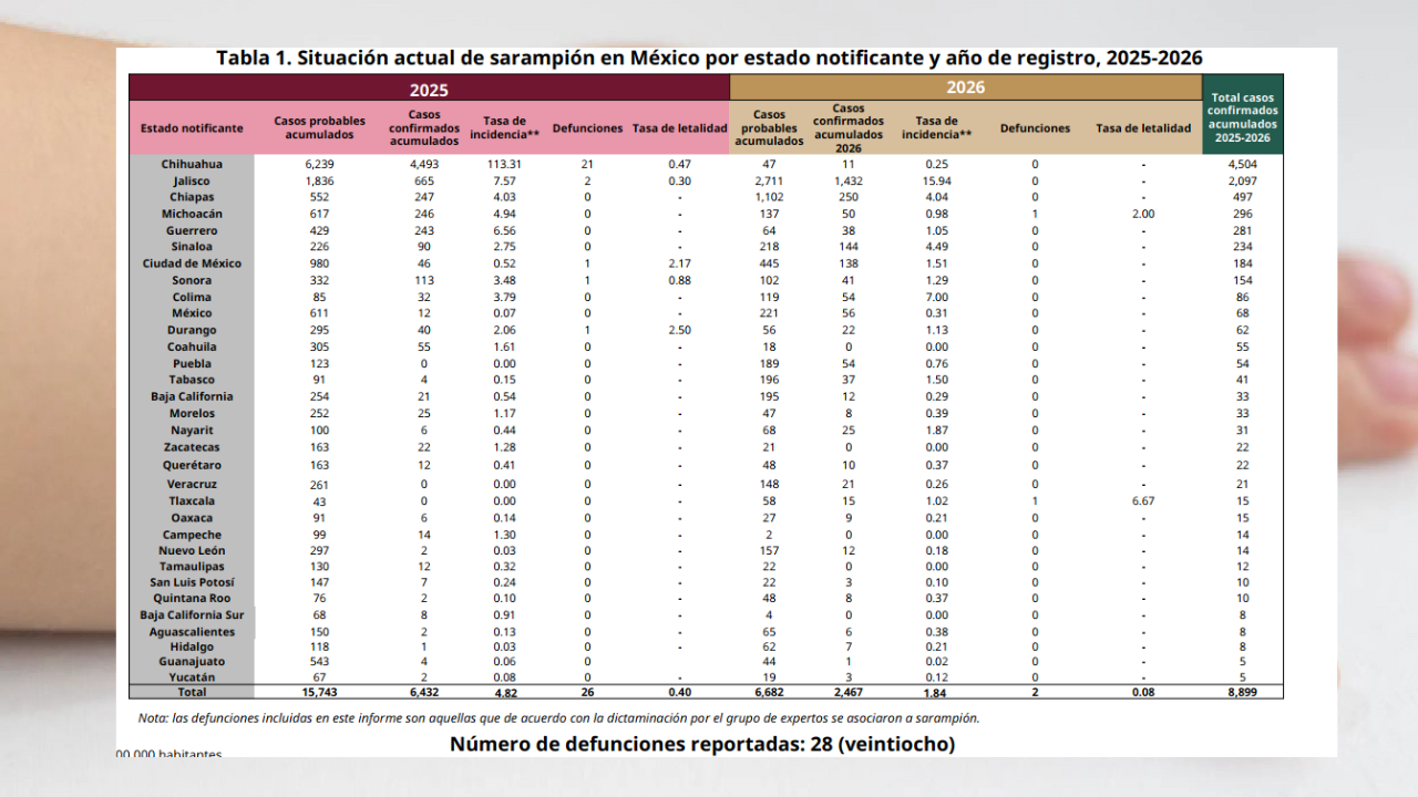 Según el informe epidemiológico más reciente, México acumula 28 defunciones por sarampión en el periodo 2025–2026, de las cuales dos corresponden a lo que va de 2026. Los fallecimientos se distribuyen en siete estados: Chihuahua concentra la mayoría, con 21 casos; le sigue Jalisco, con dos, y Sonora, Durango, Michoacán, Tlaxcala y la Ciudad de México, con un deceso cada uno.