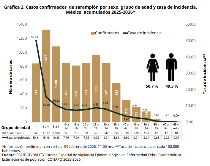 El reporte señala que el sarampión continúa afectando de manera desproporcionada a la población infantil. El grupo de edad con más casos confirmados es el de 1 a 4 años, con mil 327 contagios, seguido por niñas y niños de 5 a 9 años, con mil 88 casos. En tercer lugar, se encuentra el grupo de 25 a 29 años, con 963 casos.