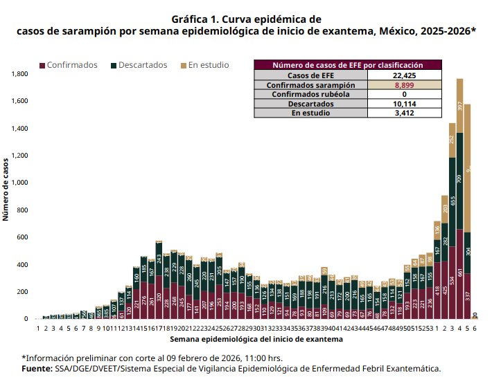 El contagio de sarampión va en ascenso, en 72 horas (del 6 al 9 de febrero) se confirmaron 324 casos y en lo que va de 2026 ya suman 2 mil 567 casos. De 2025 a 2026 se acumulan 8 mil 899 casos.