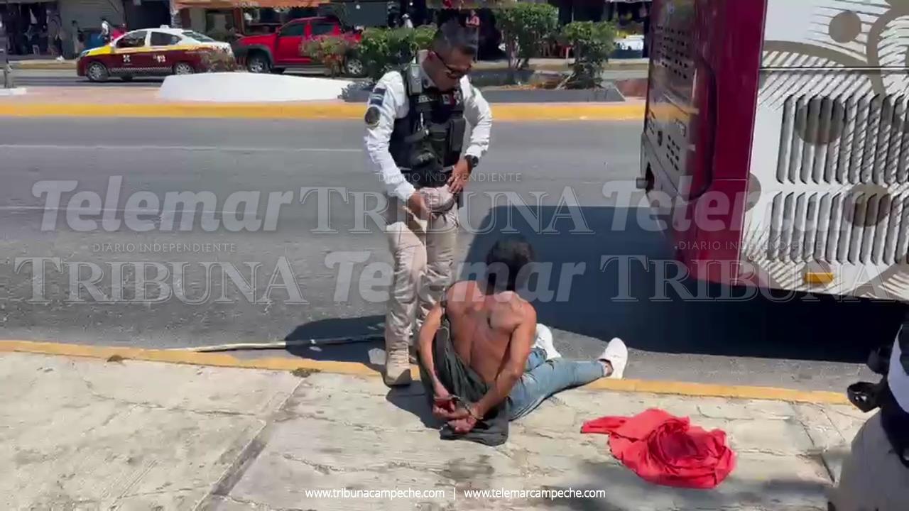 Un sujeto identificado bajo el alias “El Viernes” fue detenido por elementos de la Policía Estatal, luego de protagonizar un altercado con el conductor de una unidad del transporte público Ko’ox, luego de que arrojó un objeto contra la unidad mientras ésta transitaba sobre la avenida Circuito Baluartes.