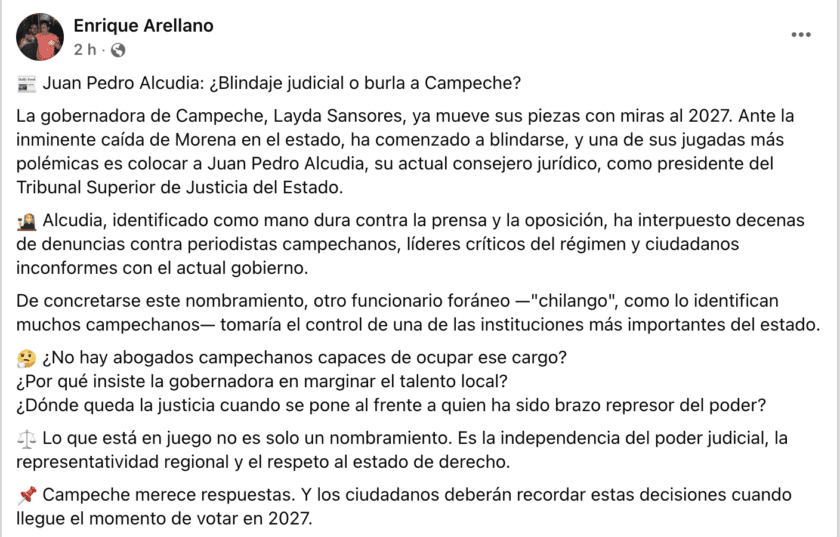A través de sus redes sociales, el cibernauta Enrique Arellano publicó que ante la inminente caída de Morena en Campeche, la gobernadora Layda Sansores estaría planificando mover sus piezas con miras al 2027, y una sería colocar a su consejero jurídico Juan Pedro Alcudia como presidente del Tribunal Superior de Justicia del Estado, lo que sería blindaje judicial y/o burla a los campechanos.