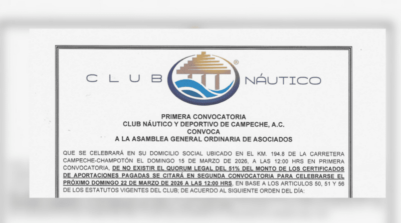 Locales CLUB NÁUTICO Y DEPORTIVO DE CAMPECHE CONVOCA A ASAMBLEA GENERAL ORDINARIA DE ASOCIADOS 10 marzo, 2026