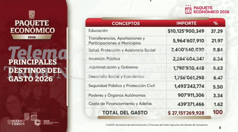 El secretario de Administración y Finanzas, Jezrael Isaac Larracilla Pérez, expuso el paquete económico 2026, cuyo presupuesto asciende a 27 mil 151 millones 269 mil 928 pesos y donde la educación vuelve a ser eje central del gasto estatal y está incluido el préstamo de mil millones de pesos para “obra productiva”.
