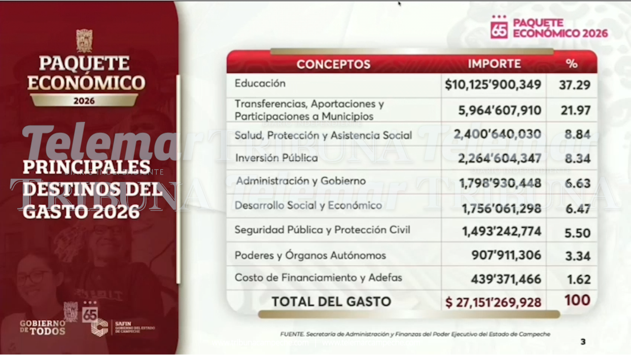 El secretario de Administración y Finanzas, Jezrael Isaac Larracilla Pérez, expuso el paquete económico 2026, cuyo presupuesto asciende a 27 mil 151 millones 269 mil 928 pesos y donde la educación vuelve a ser eje central del gasto estatal y está incluido el préstamo de mil millones de pesos para “obra productiva”.