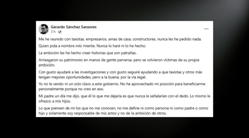 Campeche.- Luego de que el abogado Manuel Iris Balán, en representación de un grupo de taxistas auxiliares o “martilos”, denunció ante la Fiscalía Anticorrupción a una persona de apellido Negroe, quien usando el nombre de Gerardo “Seso Loco” Sánchez Sansores se apropió de un programa de auxilio a la mujer para pedir apoyos urgentes desde 75 mil hasta 300 mil pesos para el Gobierno Estatal, a cambio de concesiones, y tras varias fechas les dijo a principios de este mes que si no salían, el sobrino de la gobernadora se comprometía a devolver el dinero, el aludido admitió que tiene “una posición”, no aclaró cuál, en el Gobierno de su tía la gobernadora y afirmó que quien pida a su nombre miente.