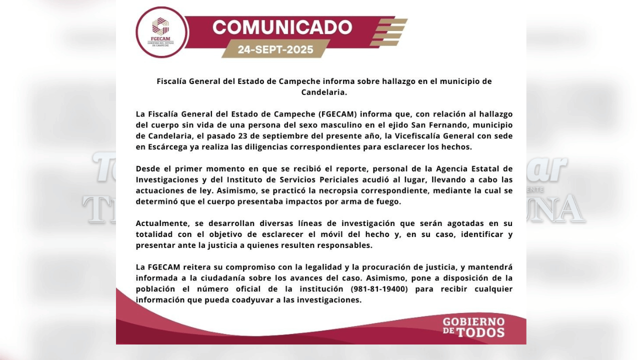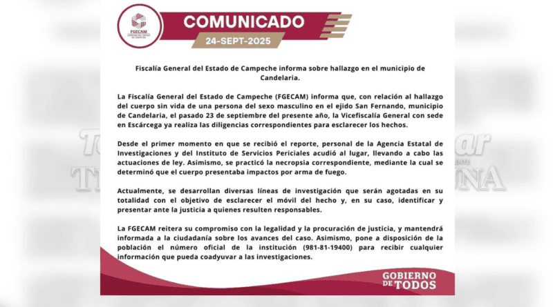 A través de un comunicado, la Fiscalía General del Estado de Campeche (FGECAM) confirmó el hallazgo del cuerpo de un hombre con impactos de bala en el ejido San Fernando, municipio de Candelaria.