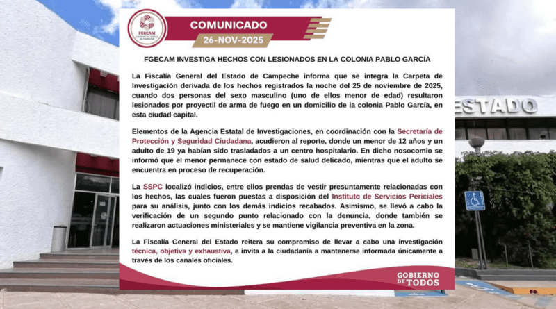 A través de un boletín, la Fiscalía General del Estado de Campeche confirmó que el menor, de edad, baleado la noche de ayer martes en un domicilio ubicado en la colonia Pablo García, está delicado de salud en el hospital.
