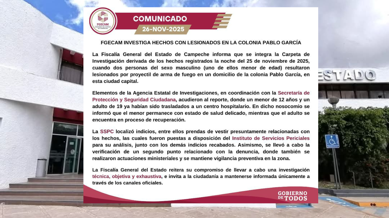 A través de un boletín, la Fiscalía General del Estado de Campeche confirmó que el menor, de edad, baleado la noche de ayer martes en un domicilio ubicado en la colonia Pablo García, está delicado de salud en el hospital.