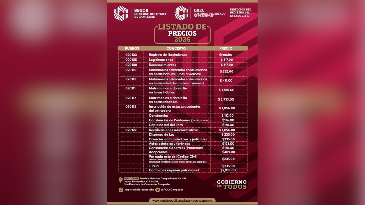 El Registro Civil, dio a conocer el listado oficial de precios para el año 2026, en el que se establecen costos para diversos trámites como matrimonios, divorcios, rectificaciones y adopciones, mientras que el registro de nacimientos se mantiene gratuito. Entre los servicios más costosos destacan los matrimonios a domicilio en horarios inhábiles y el cambio de régimen patrimonial, ambos con tarifas que superan los 2 mil 900 pesos, en contraste con otros trámites básicos que rondan entre los 117 y 235 pesos.