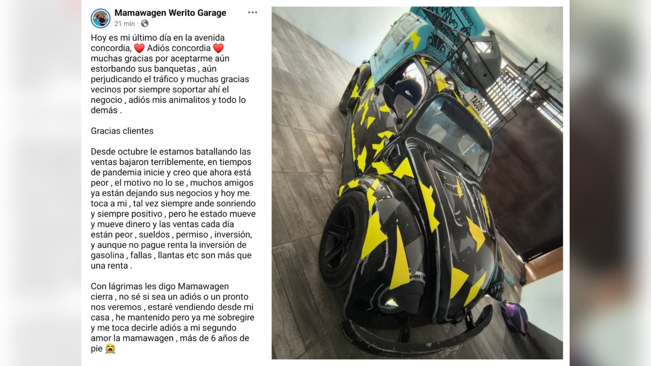 En una emotiva despedida en sus redes sociales, “Mamawagen Werito Garage” escribió: “Hoy es mi último día en la avenida Concordia… Muchas gracias por aceptarme aún estorbando sus banquetas, perjudicando el tráfico y muchas gracias**, vecinos** por siempre soportar el negocio, adiós mis animalitos y todo lo demás”.