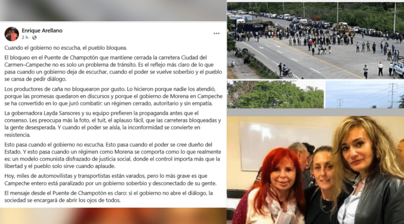 El texto dice: “El bloqueo en el puente de Champotón que mantiene cerrada la carretera Ciudad del Carmen–Campeche no es sólo un problema de tránsito. Es el reflejo más claro de lo que pasa cuando un Gobierno deja de escuchar, cuando el poder se vuelve soberbio y el pueblo se cansa de pedir diálogo. Los productores de caña no bloquearon por gusto. Lo hicieron porque nadie los atendió, porque las promesas quedaron en discursos y porque el Gobierno de Morena en Campeche se ha convertido en lo que juró combatir: un régimen cerrado, autoritario y sin empatía”.