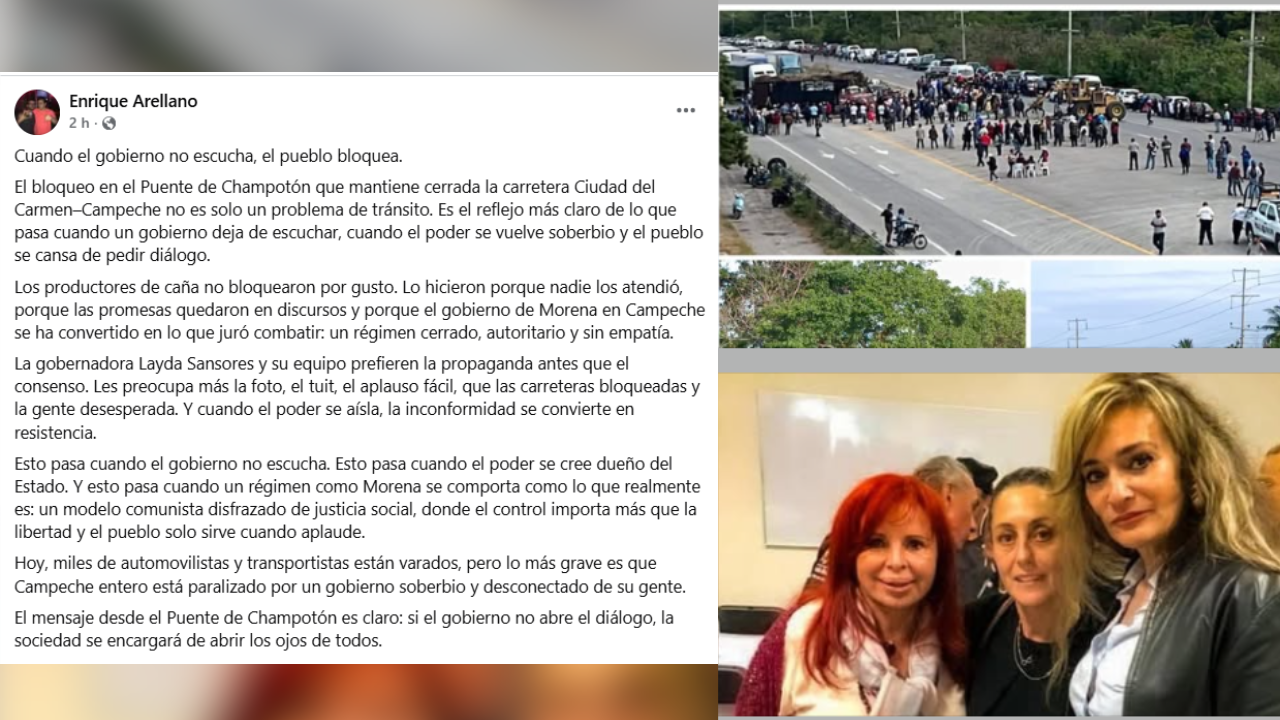 La gobernadora Layda Sansores y su equipo, agrega Enrique Arellano, prefieren la propaganda antes que el consenso. Les preocupa más la foto, el tuit, el aplauso fácil, que las carreteras bloqueadas y la gente desesperada. Y cuando el poder se aísla, la inconformidad se convierte en resistencia. Esto pasa cuando el Gobierno no escucha. Esto pasa cuando el poder se cree dueño del Estado. Y esto pasa cuando un régimen como Morena se comporta como lo que realmente es: un modelo comunista disfrazado de justicia social, donde el control importa más que la libertad y el pueblo sólo sirve cuando aplaude.