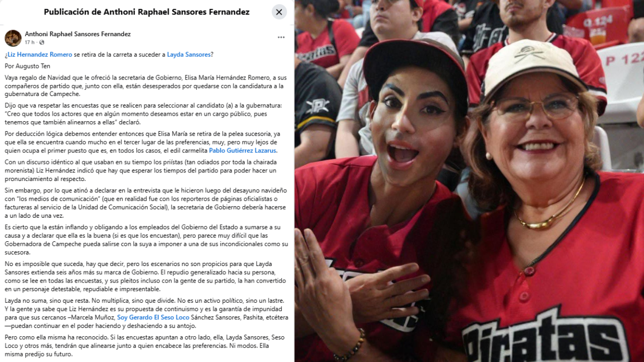 En una publicación a través de sus redes sociales, el analista Anthoni Raphael Sansores Fernández replica un comentario político de Augusto Ten titulado “¿Liz Hernández Romero se retira de la carreta a suceder a Layda Sansores?”, donde, afirma, la secretaria de Gobierno ya anunció que se retira de la pelea sucesoria al afirmar que todos los aspirantes deben alinearse a las encuestas, pues ella aparece cuando mucho en tercer lugar pero muy lejos del primero, por lo cual tanto ella como Layda Sansores, Seso Loco y otros más, tendrán que alinearse junto a quien encabece las preferencias.