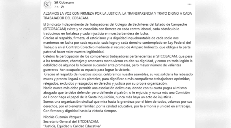 A través de redes sociales, el secretario general de la agrupación, Nicolás Guzmán Vázquez, aseguró que pese a las presiones, chantajes y amenazas, los trabajadores mantienen en alto su dignidad y siguen defendiendo su derecho a la libre asociación sindical.