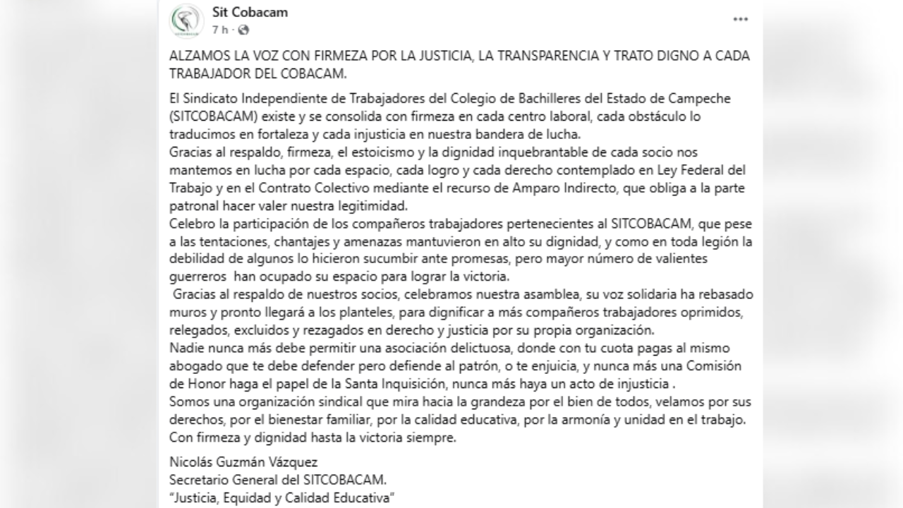 A través de redes sociales, el secretario general de la agrupación, Nicolás Guzmán Vázquez, aseguró que pese a las presiones, chantajes y amenazas, los trabajadores mantienen en alto su dignidad y siguen defendiendo su derecho a la libre asociación sindical.
