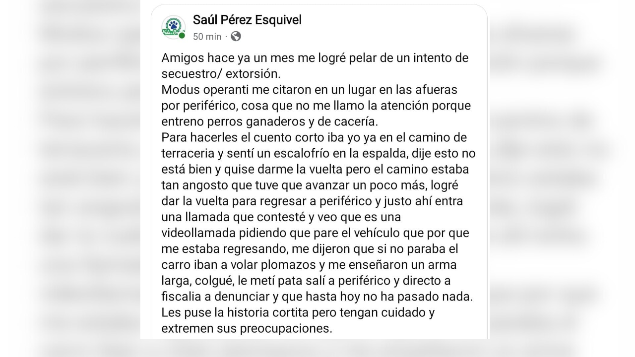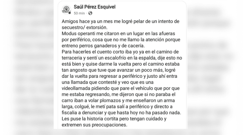 Saúl Pérez Esquivel, entrenador de perros, denunció públicamente que hace un mes fue víctima de un intento de secuestro y extorsión en las afueras de la ciudad, concretamente sobre el periférico de Campeche, sin que hasta el momento las autoridades hayan dado respuesta a su denuncia.