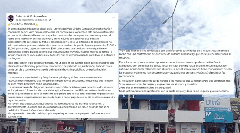 San Francisco de Campeche.- A través de una denuncia anónima difundida por el colectivo Furias del Golfo Anarcofem, son expuestas presuntas irregularidades en la Universidad Valle Grijalva (UVG), Campus Campeche, relacionadas con “recortes” de horas a docentes, condiciones laborales precarias y omisiones en la atención a estudiantes y profesores.