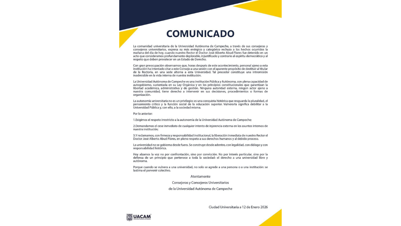 San Francisco de Campeche.- Tras la detención de José “A”, personal ajeno a la Universidad Autónoma de Campeche ha intentado citar al Consejo a una sesión en una sede alterna, con el aparente objetivo de destituir al titular de la Rectoría, denunciaron consejeras y consejeros universitarios, y exigieron el respeto irrestricto a la autonomía de la UAC, el cese de cualquier intento de injerencia externa en los asuntos internos de la institución y la liberación inmediata del rector.