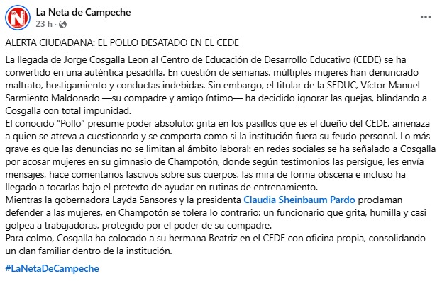 Conocido como “El Pollo” entre sus amigos, Cosgalla León presume en voz alta que es el dueño del CEDE, amenaza a quien se atreva a cuestionarlo y se comporta como si la institución fuera su feudo personal, y lo más grave es que las denuncias en su contra no son sólo en el ámbito laboral, pues en redes sociales ha sido señalado anteriormente como acosador de mujeres en su gimnasio de Champotón, ya que según testimonios las persigue, les envía mensajes, hace comentarios lascivos sobre sus cuerpos, las mira de forma obscena y ha llegado a tocarles partes indebidas bajo el pretexto de ayudar en rutinas de entrenamiento.