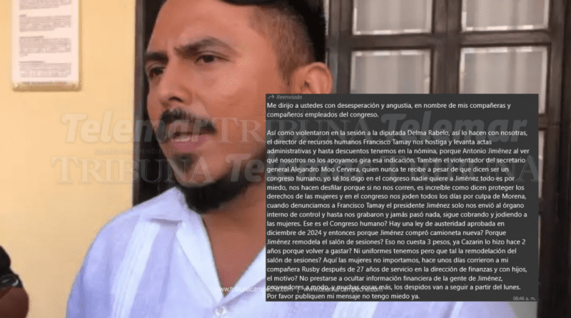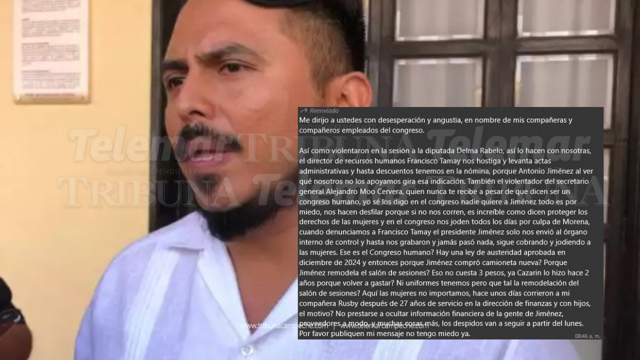 “Me dirijo a ustedes con desesperación y angustia, en nombre de mis compañeras y compañeros empleados del Congreso. Así como violentaron en la sesión a la diputada Delma Rabelo, así lo hacen con nosotras; el director de Recursos Humanos, Francisco Tamay, nos hostiga y levanta actas administrativas y hasta descuentos tenemos en la nómina, porque Antonio Jiménez al ver que nosotros no los apoyamos gira esa indicación”.
