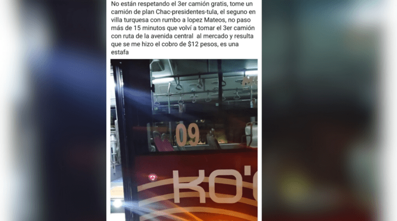 El denunciante explica que abordó el primer camión de la ruta Plan Chac-Presidentes-Tula y el segundo en Villa Turquesa rumbo a la López Mateos, y no transcurrieron más de 15 minutos para subirse a otro que cubre avenida Central-mercado y le cobraron la primera tarifa.
