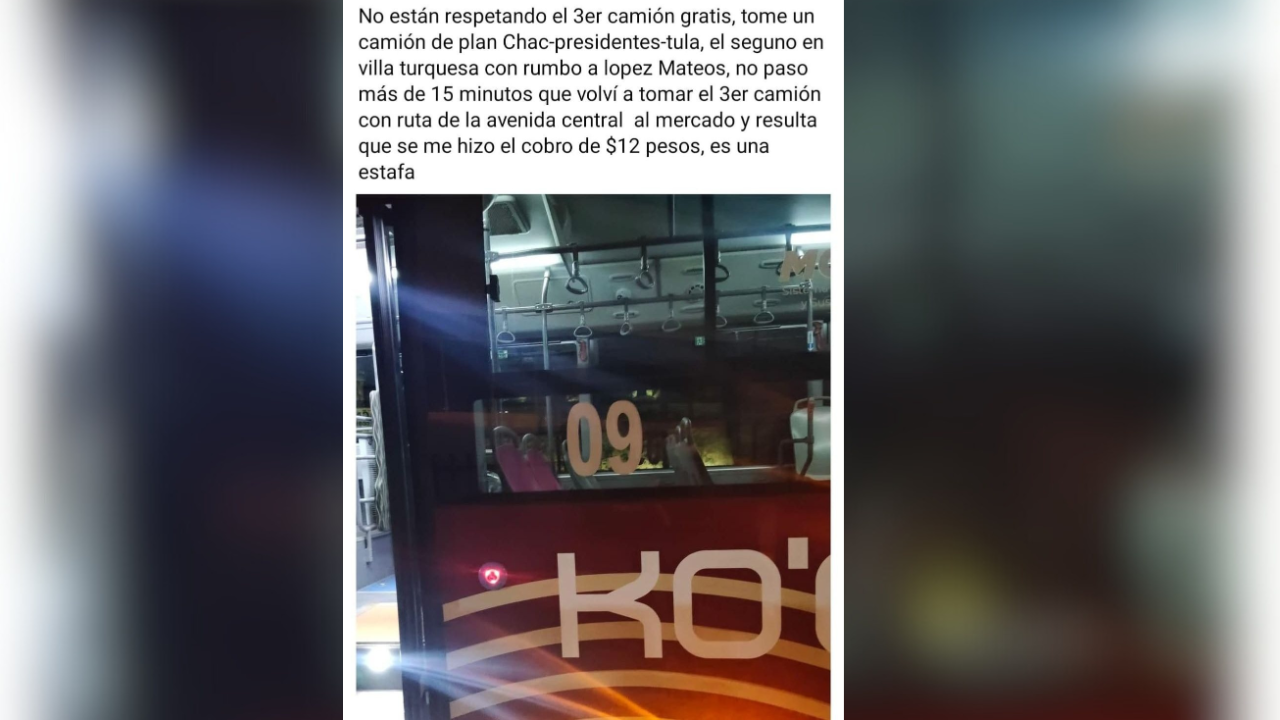 En las redes sociales circula la queja de un usuario contra el sistema de transporte público Ko’ox, por no respetar el tercer transbordo gratuito, pues le cobraron 12 pesos pese a estar dentro del tiempo establecido para que sea gratuito.