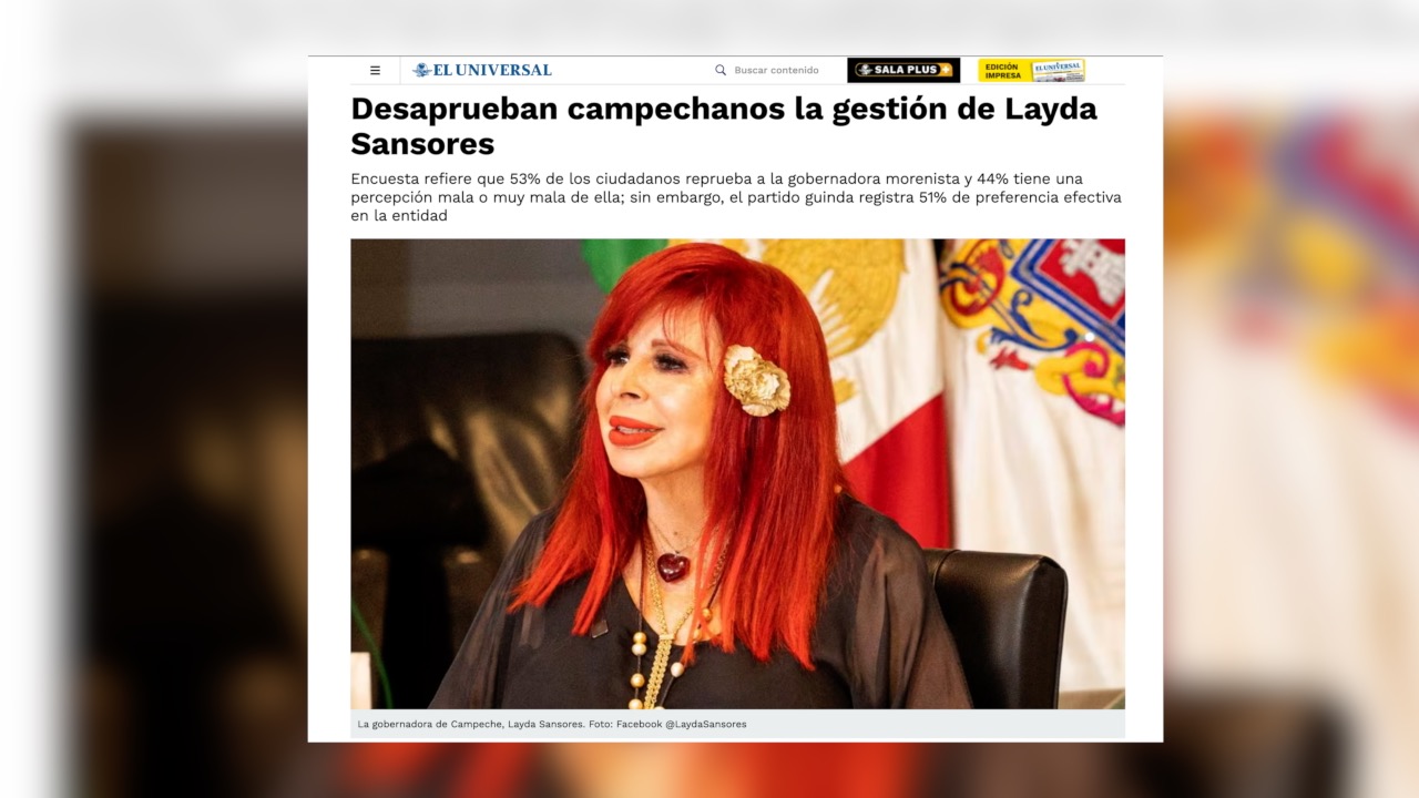 En Campeche, la percepción ciudadana refleja un escenario político contrastado: mientras la gobernadora Layda Sansores obtiene una aprobación reprobatoria y una opinión mayoritariamente negativa, la presidenta Claudia Sheinbaum mantiene un amplio respaldo ciudadano y Morena conserva su fuerza electoral en la entidad, de acuerdo con la más reciente encuesta de Enkoll para EL UNIVERSAL.
