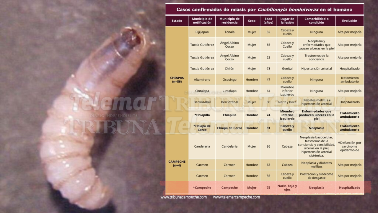 Se confirmó el primer caso de miasis por Cochliomyia hominivorax, conocido como gusano barrenador, en la capital del estado de Campeche, de acuerdo con el Boletín Epidemiológico Nacional. Se trata de una mujer de 75 años de edad que actualmente se encuentra hospitalizada. Según el reporte, las lesiones se localizan en nariz, boca y ojos, y la paciente presenta como comorbilidad una neoplasia.