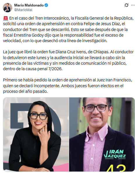 De acuerdo con Mario Maldonado, columnista de El Universal y conductor de Noticias de la Mañana en El Heraldo de México, la Fiscalía General de la República solicitó una orden de aprehensión contra Felipe de Jesús Díaz, conductor del Tren Interoceánico que se descarriló el pasado 28 de diciembre en Oaxaca.