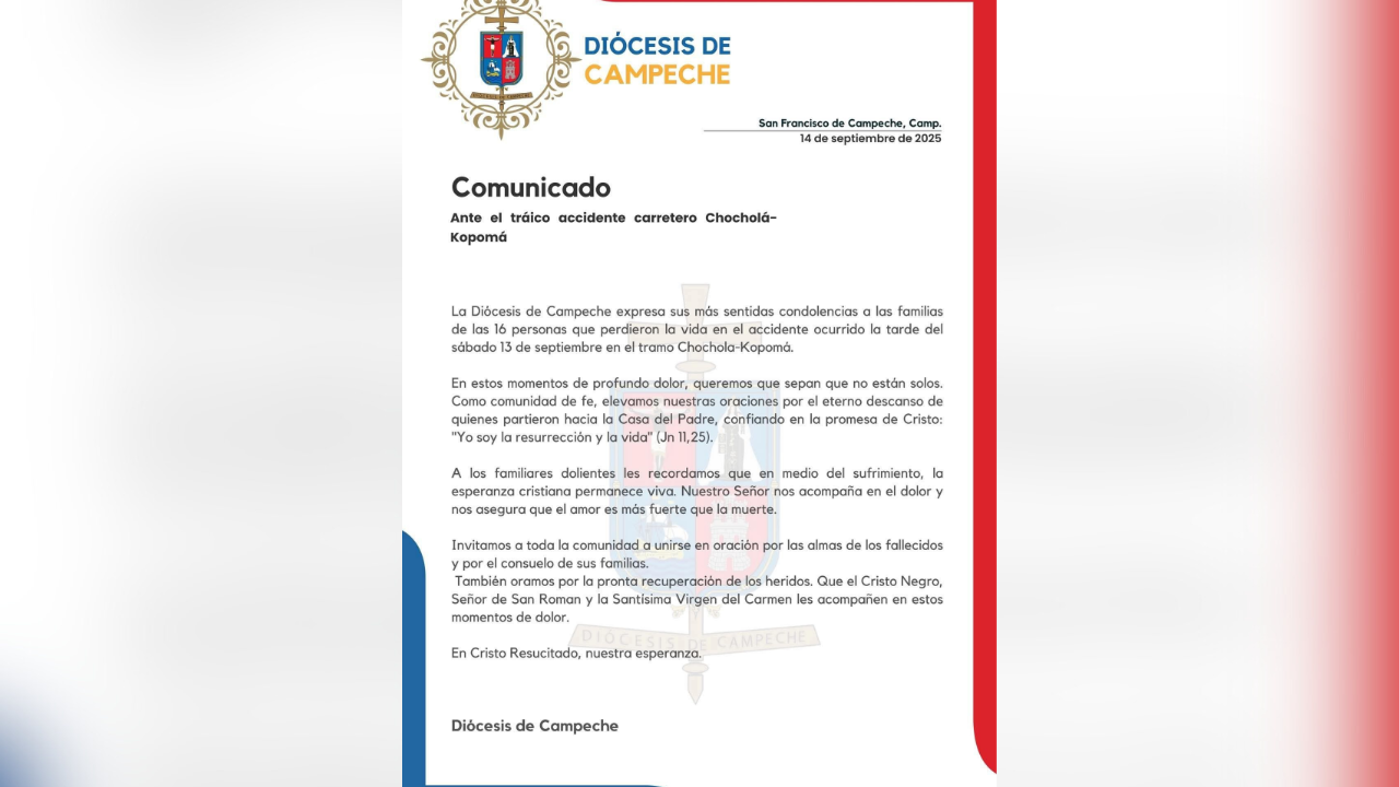 La Diócesis de Campeche lamentó la muerte de las 16 personas que perdieron la vida en el accidente carretero ocurrido en el tramo Mérida–Campeche, donde también resultaron heridos varios pasajeros.