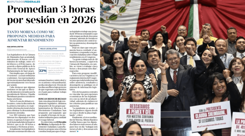 Entre el 11 de febrero y el 19 de marzo de 2026, la Cámara de Diputados acumuló 41 horas con 47 minutos de trabajo en sesiones del pleno, lo que equivale a un promedio cercano a tres horas por sesión, de acuerdo con información difundida por el analista Juan Ortiz, basada en datos revisados por El Heraldo de México.