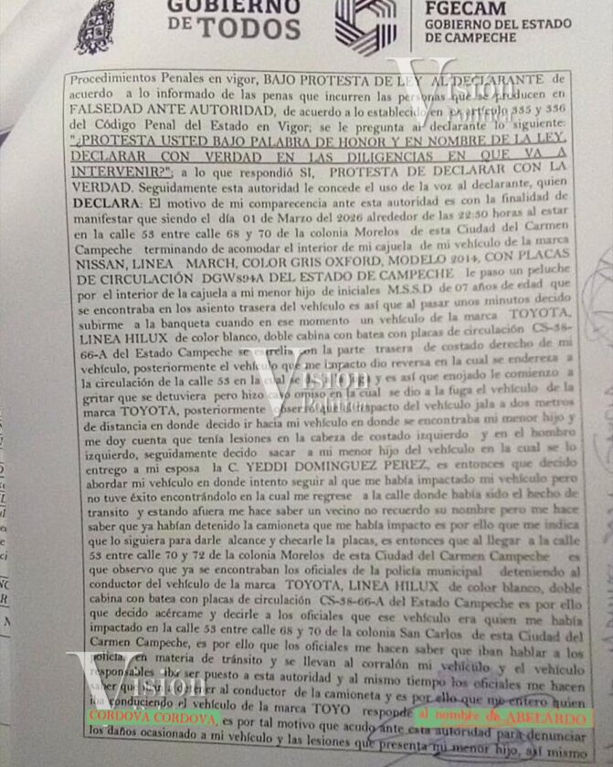 Tras impactar su camioneta, que la noche del pasado domingo 1 de marzo conducía bajo los influjos del alcohol, contra un auto estacionado en cuyo interior había un niño de 7 años de edad que sufrió golpes en cabeza y hombro, huir y ser detenido y liberado por la Policía de Pablo Gutiérrez en lugar de turnarlo a la Vicefiscalía Regional en Carmen, el dirigente de Morena en Carmen, Abelardo Jiménez Córdova, fue denunciado penalmente por daños en propiedad ajena y lesiones.