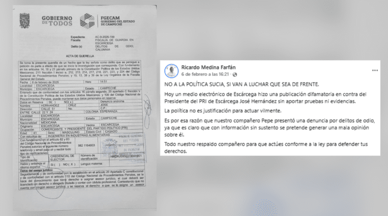 En sus redes sociales, el dirigente estatal del Partido Revolucionario Institucional (PRI), Ricardo Medina Farfán, dio a conocer que el represente priísta en Escárcega, José Hernández, denunció por los delito de odio y calumnia a un medio electrónico de ese Municipio por una publicación que calificó como difamatoria por falta de pruebas y evidencias.