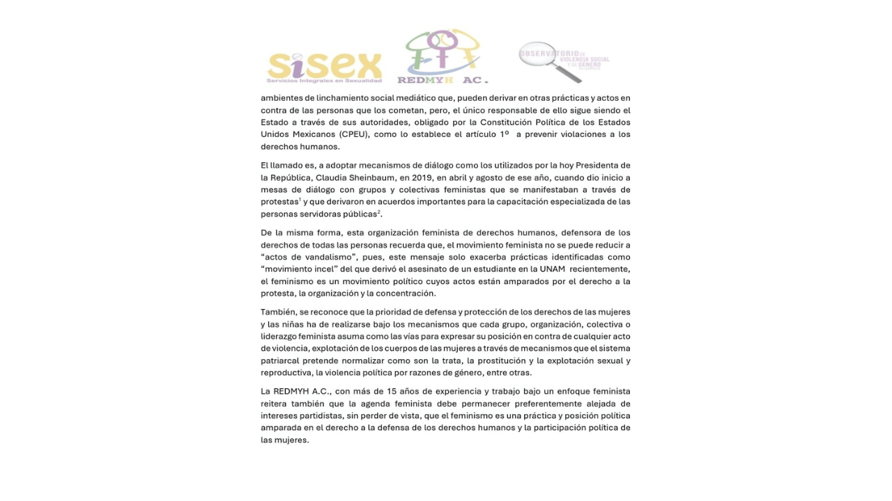 La Red de Mujeres y Hombres por una Opinión Pública con Perspectiva de Género (Redmyh A. C.) hizo un enérgico llamado a las autoridades a evitar discursos que estigmaticen al movimiento feminista, y advirtió que este tipo de mensajes pueden derivar en prácticas de linchamiento social y fomentar expresiones de odio como las asociadas al llamado “movimiento incel”.