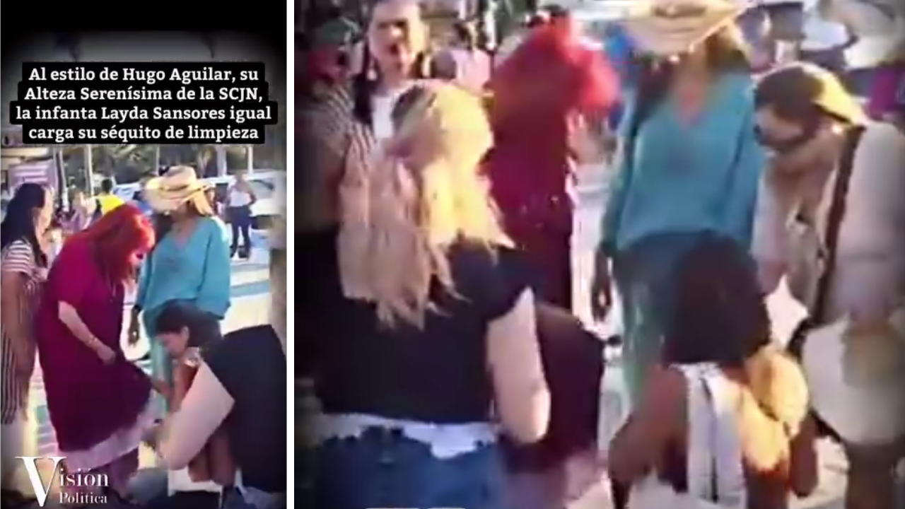 Ayer jueves 2 de abril en la Feria del Mar de Carmen 2026, se vivió una escena que hizo recordar al ministro presidente de la Suprema Corte de Justicia de la Nación (SCJN), Hugo Aguilar, cuando la gobernadora Layda Sansores observó y supervisó que dos mujeres que la acompañaban, una de las cuales se agachó y la otra se inclinó, le limpiaran la suciedad en la parte baja de su vestido.