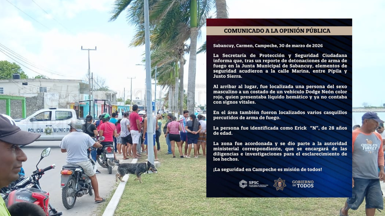 Un joven identificado como Erick, de 28 años, perdió la vida este lunes tras ser ejecutado con arma de fuego en la comunidad de Sabancuy, en el municipio de Carmen. Hasta el momento no hay personas detenidas.