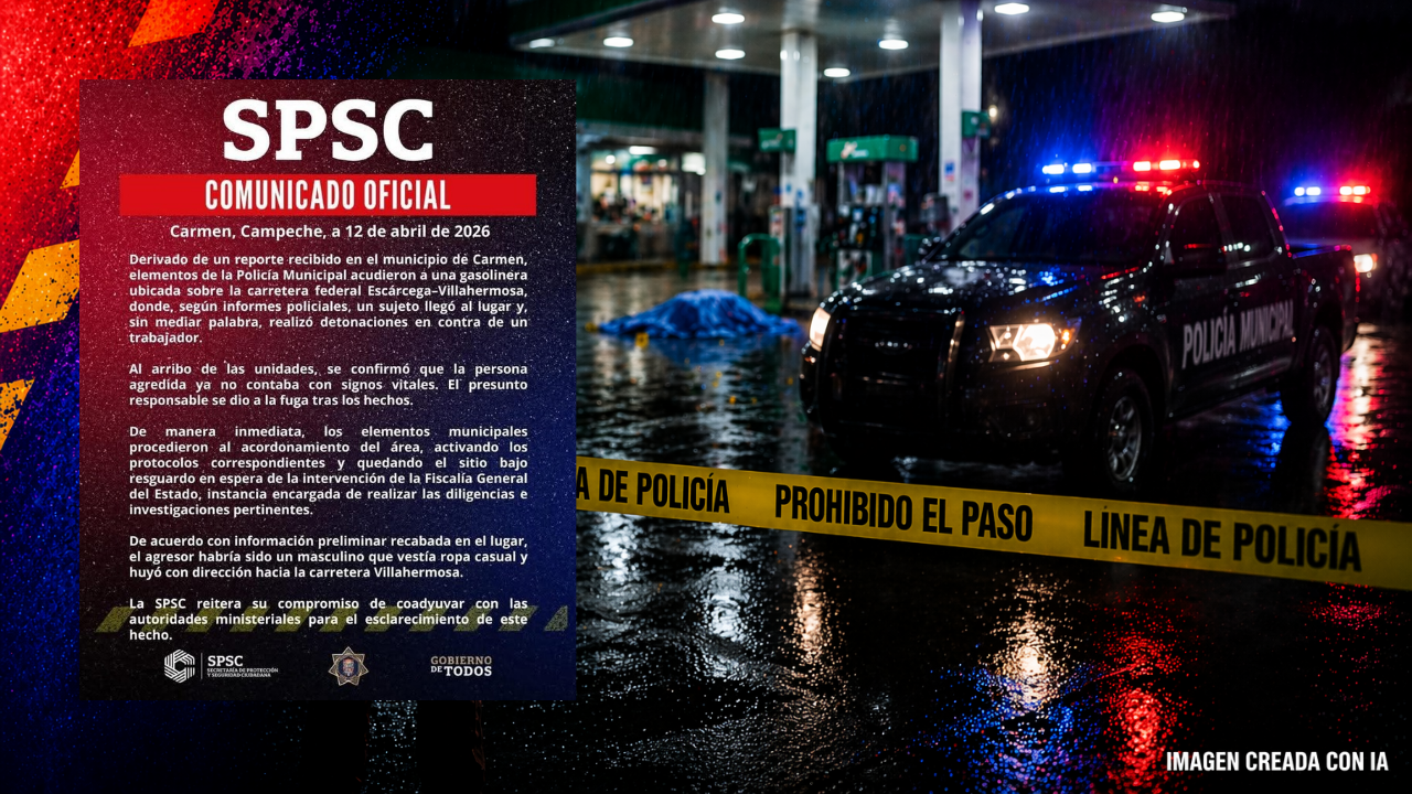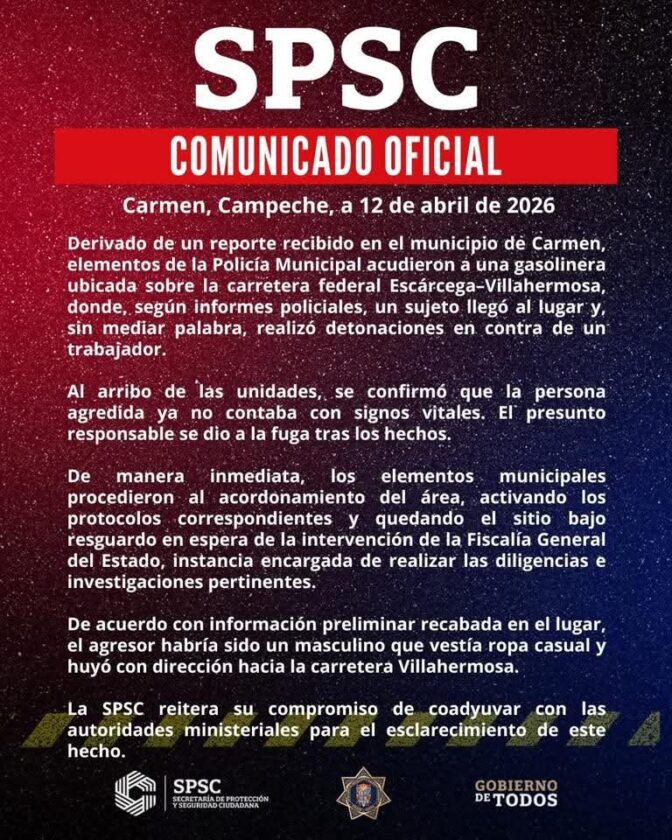 Un ataque armado registrado en una gasolinera sobre la carretera federal Escárcega–Villahermosa dejó como saldo a un trabajador sin vida. El agresor llegó al sitio y abrió fuego de forma directa contra la víctima, quien falleció en el lugar; tras la agresión, huyó con rumbo hacia la carretera Villahermosa, lo que provocó un operativo en la zona.